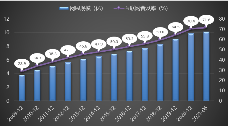 图3展示了2009-2021年全国网民规模及互联网普及率变化情况,从图中可以看出,截至 2021年6月,我国网民总体规模超过10亿,庞大的网民规模为推动我国经济高质量发展提供强大内生动力,加速我国数字新基建建设、打通国内大循环、促进数字政府服务水平提升。