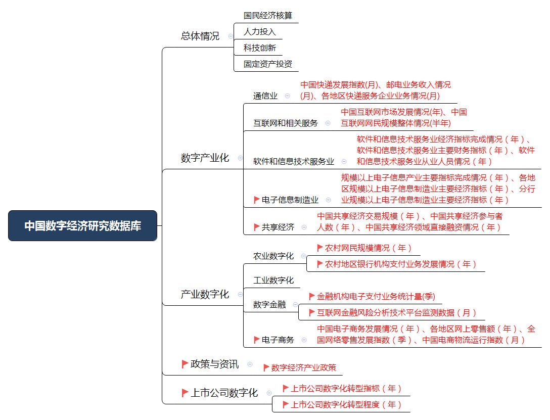 CSMAR数字经济研究数据库提供经济发展总体情况(国民经济核算、人力投入、科技创新、固定资产投资)、数字产业化(通信业、互联网和相关服务、软件和信息技术服务业、电子信息制造业、共享经济)、产业数字化(农业数字化、工业数字化、数字金融、电子商务)、政策与资讯及上市公司数字化数据。