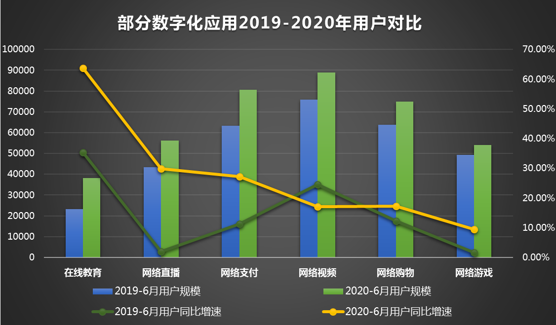 图4展示了2019-2020年,在生活领域,部分数字化应用的用户规模及同比增速情况。2020年上半年,出于疫情防控需要,经济活动加速向线上迁移,人民必须居家完成工作、教育、饮食、娱乐等活动,在线教育、网络直播、网络支付、网络购物、网络游戏用户同比增速均快于2019年上半年。新冠疫情在极短时间内激发了数字化新需求,推动数字化转型跨越式发展。